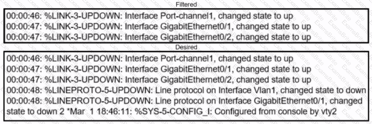Refer to the exhibits. An engineer filtered messages based on severity to minimize log messages. After applying the filter, the engineer noticed that it filtered required messages as well. Which action must the engineer take to resolve the issue?