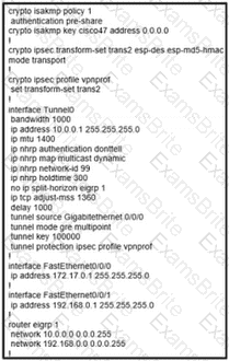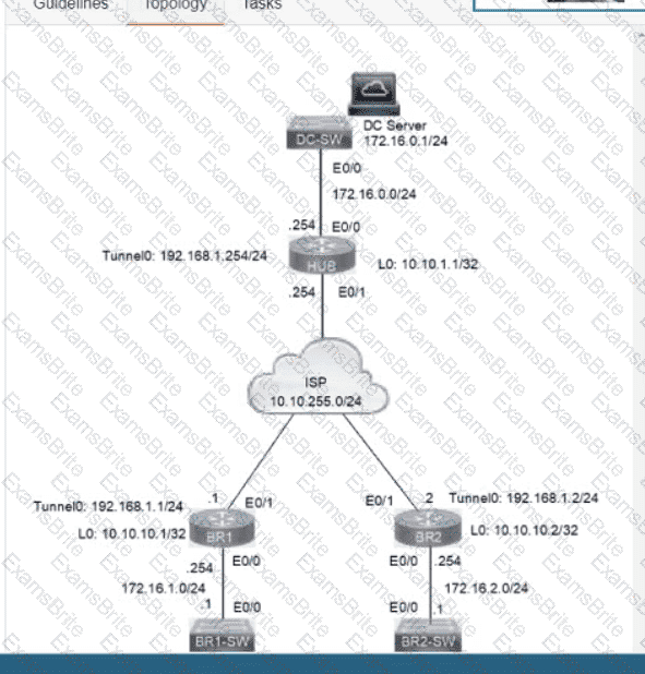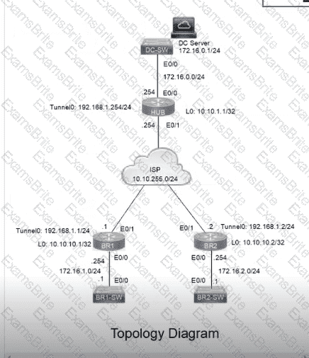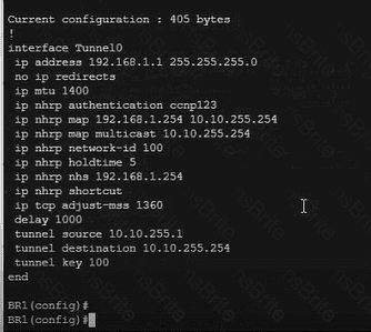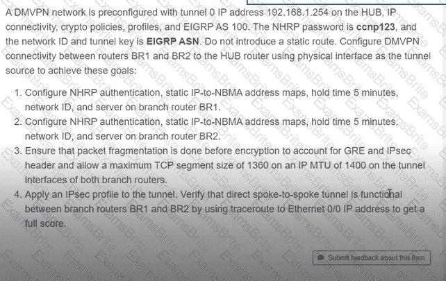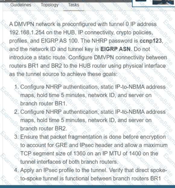 A DMVPN network is preconfigured with tunnel 0 IP address 192.168.1.254 on the HUB, IP connectivity, crypto policies, profiles, and EIGRP AS 100. The NHRP password is ccnp123, and the network ID and tunnel key is EIGRP ASN Do not introduce a static route. Configure DMVPN connectivity between routers BR1 and BR2 to the HUB router using physical interface as the tunnel source to achieve these goals: