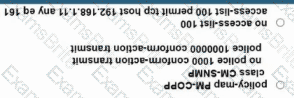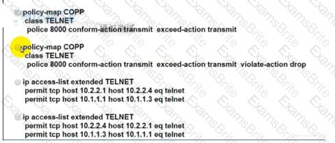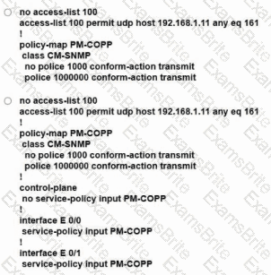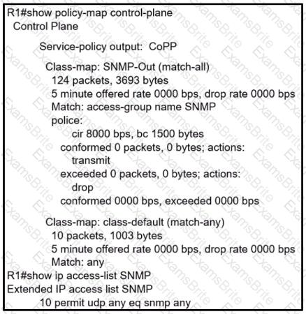 The network administrator configured CoPP so that all SNMP traffic from Cisco Prime located at 192.168.1.11 toward the router CPU is limited to 1000 kbps. Any traffic that exceeds this limit must be dropped.