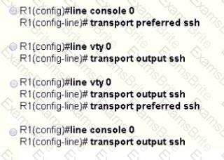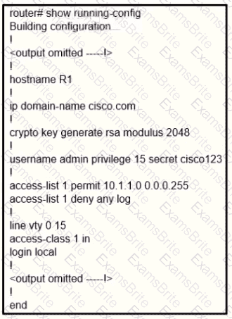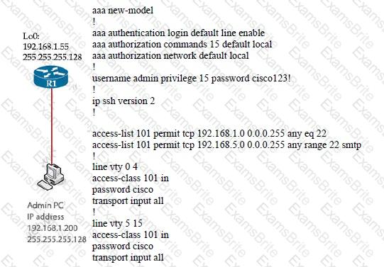 Which two actions restrict access to router R1 by SSH? (Choose two.)