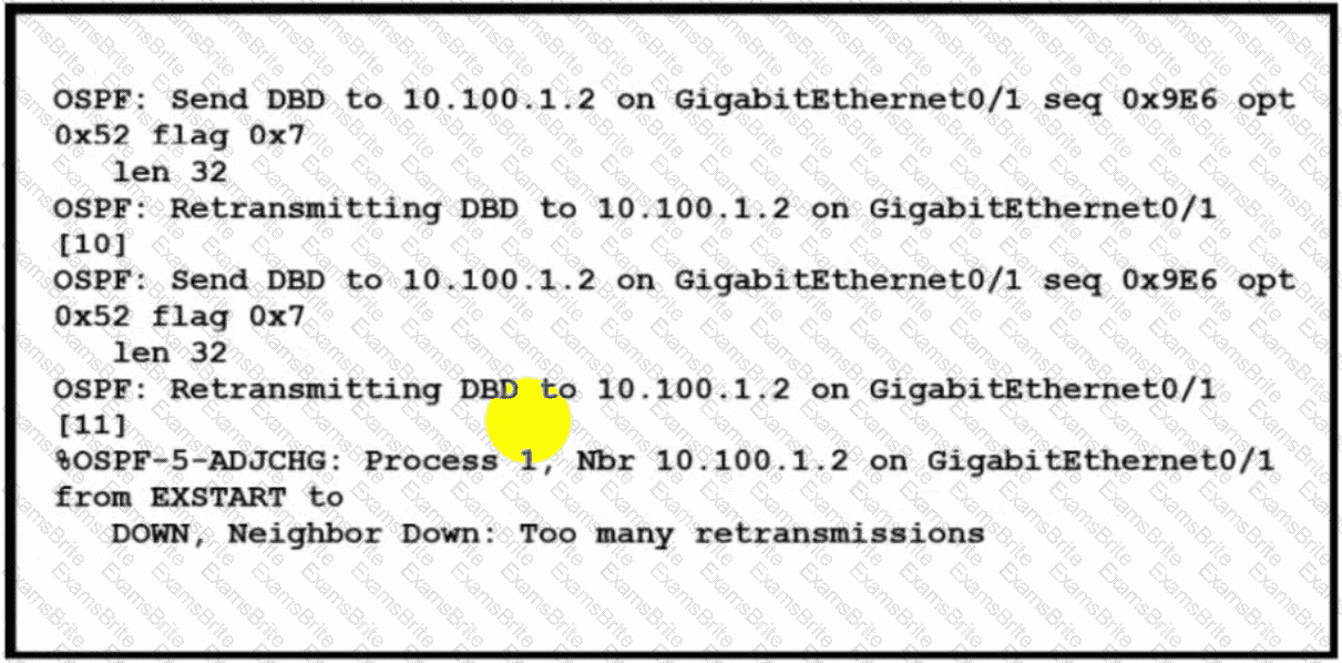 A network administrator is using the DNA Assurance Dashboard panel to troubleshoot an OSPF adjacency that failed between Edge_NYC interface GigabitEthernet1/3 with Neighbor Edge_SNJ. The administrator observes that the neighborship is stuck in exstart state. How does the administrator fix this issue?