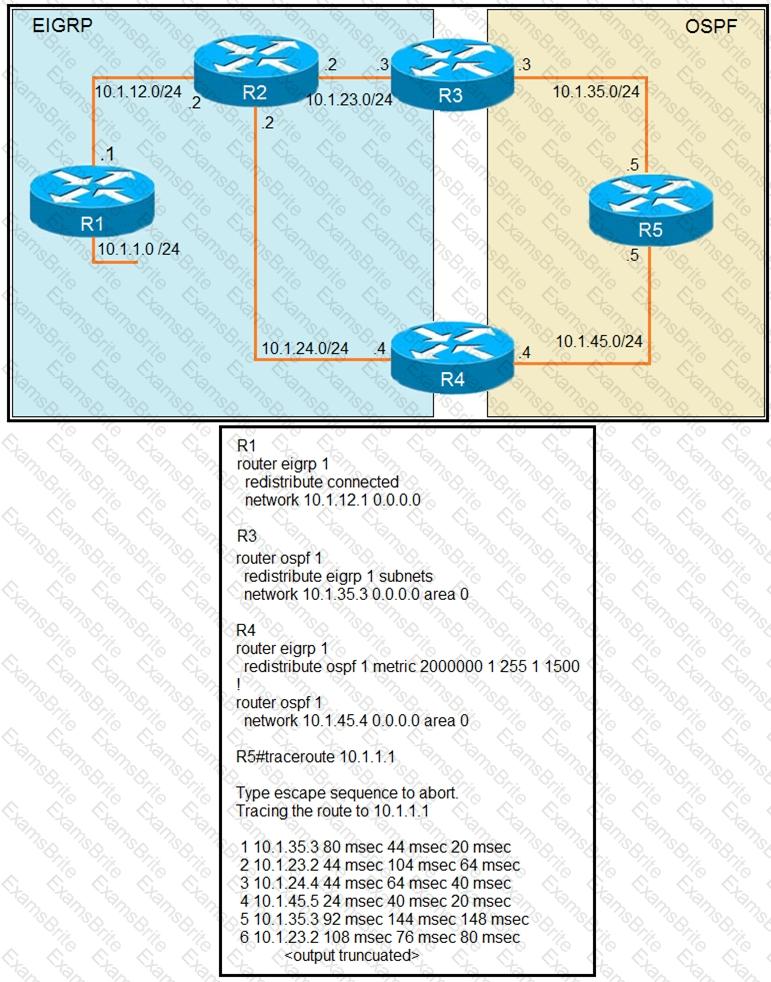To provide reachability to network 10.1.1.0 /24 from R5, the network administrator redistributes EIGRP into OSPF on R3 but notices that R4 is now taking a ........... path through R5 to reach 10.1.1.0/24 network. Which action fixes the issue while keeping the reachability from R5 to 10.1.1.0/24 network?