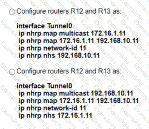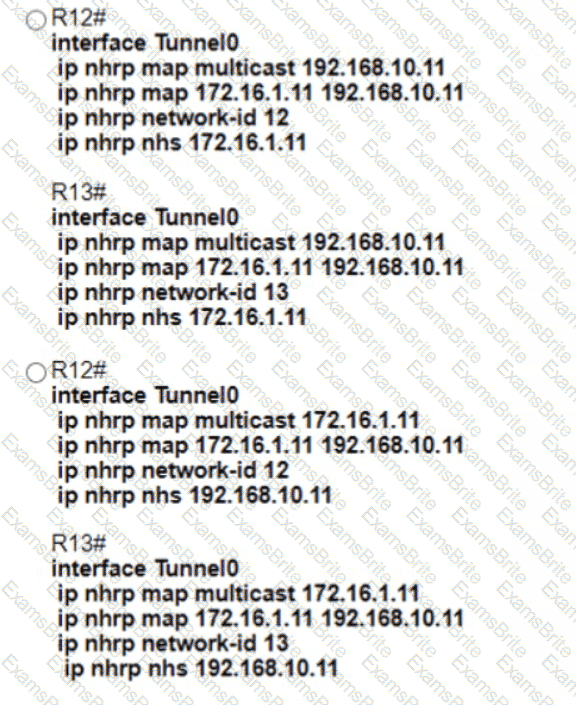 Refer to the exhibit A company builds WAN infrastructure between the head office and POPs using DMVPN hub-and-spoke topology to provide end-to-end communication All POPs must maintain point-to-point connectivity with the head office Which configuration meets the requirement at routers R12 and R13?
