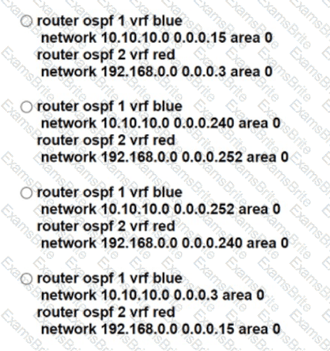 An engineer configured VRF-Lite on a router for VRF blue and VRF red. OSPF must be enabled on each VRF to peer to a directly connected router in each VRF. Which configuration forms OSPF neighbors over the network 10.10.10.0/28 for VRF blue and 192.168.0.0/30 for VRF red?