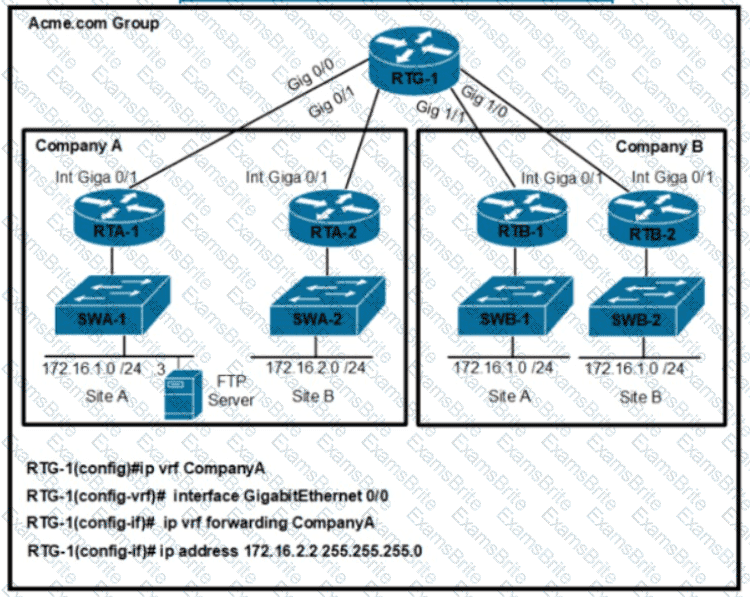 Refer to the exhibit. An engineer must configure a per VRF for TACACS+ for company A. Which configuration on RTG-1 accomplishes the task?