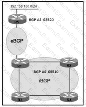 AS65510 iBGP is configured for directly connected neighbors. R4 cannot ping or traceroute network 192 168.100.0/24 Which action resolves this issue?