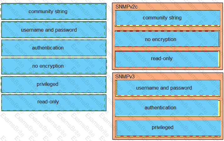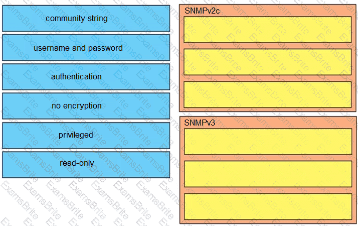 Drag and drop the SNMP attributes in Cisco IOS devices from the left onto the correct SNMPv2c or SNMPV3 categories on the right.