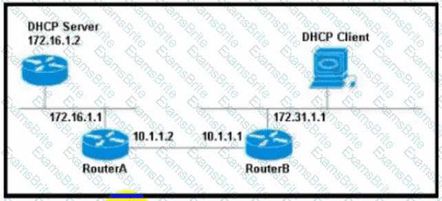 Refer to the exhibit. The DHCP client is unable to receive an IP address from the DHCP server RouterB is configured as follows: