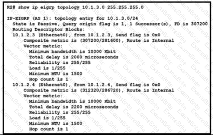 Refer to the exhibit. A network is configured for EIGRP equal-cost load balancing, but the traffic destined to the servers is not load balanced. Link metrics from router R2 to R3 and R4 are the same. Which delay value must be configured to resolve the issue?