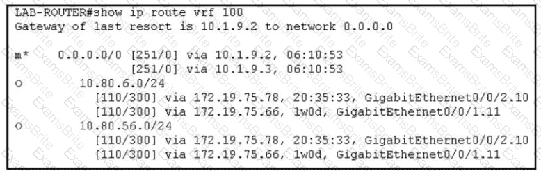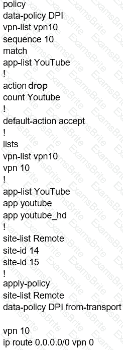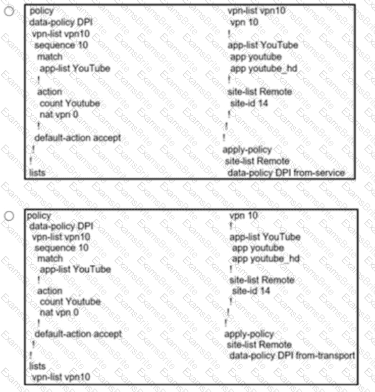 Refer to the exhibit. The network administrator has configured a centralized topology policy that results in the displayed routing table at a branch office. Which two configurations are verified by the output? [Choose two.)