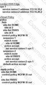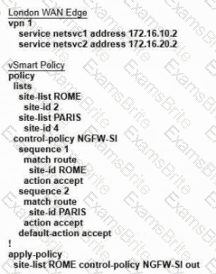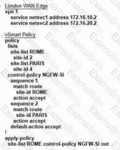 Refer to the exhibit. The Cisco SD-WAN is deployed using the default topology. The engineer wants to configure a service insertion policy such that all data traffic between Rome to Paris is forwarded through the NGFW located in London. Which configuration fulfills this requirement, assuming that the Service VPN ID is 1?