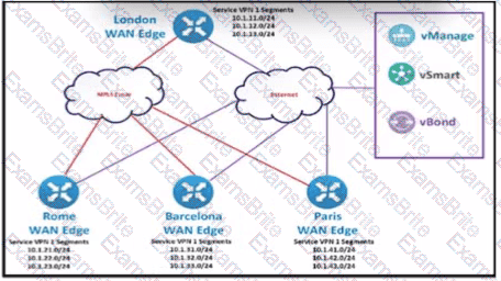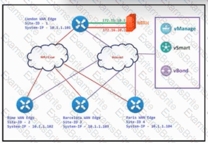 The SD-WAN network is configured with a default full-mash topology. An engineer wants Barcelona and Paris to communicate to each other through the London site using a control Which control policy configuration accomplishes the task?