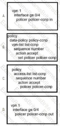 An administrator wants to create a policy to add a traffic policer called "politer-ccnp" to police data traffic on the WAN Edge. Which configuration accomplishes this task in vSmart?