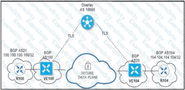 An engineer configured OMP with an overlay-as of 10666. What is the AS-PATH for prefix 104.104.104.104/32 on R100?