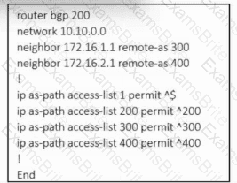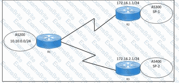 Refer to the exhibit. An engineer must configure multihoming between router R1 and service providers SP-1 and SP-2. Locally generated routes must be advertised to the service providers, and should prevent the risk that the local autonomous system becomes a transit AS for Internet traffic. Which two commands must be run on R1 to complete the configuration? (Choose two.)
