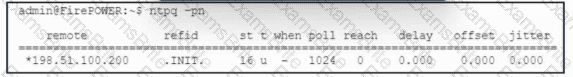 Refer to the exhibit. A security engineer views the health alerts in Cisco Secure Firewall Management Center by using the Health Monitor in the web interface. One of the alerts shows an appliance as critical because the Time Synchronization module status is out of sync. To troubleshoot the issue, the engineer runs the ntpq command in Secure Firewall Management Center. The output is shown in the exhibit. Which action must the security engineer take next to resolve the issue?