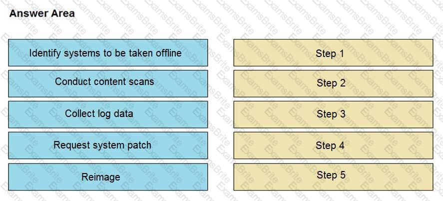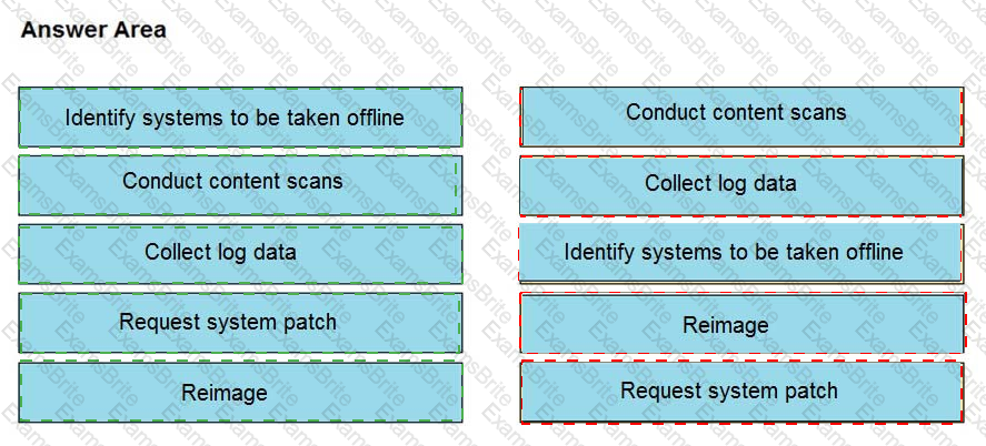 An engineer notices that unauthorized software was installed on the network and discovers that it was installed by a dormant user account. The engineer suspects an escalation of privilege attack and responds to the incident. Drag and drop the activities from the left into the order for the response on the right.