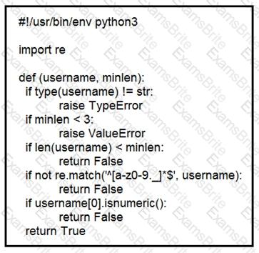 The application administrator has to manually change and track these daily to ensure compliance. An engineer is tasked to implement a script to automate the process according to the company user creation policy. The engineer implemented this piece of code within the application, but users are still able to create format-free usernames. Which change is needed to apply the restrictions?