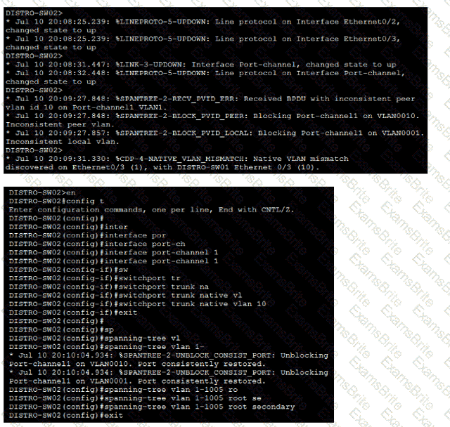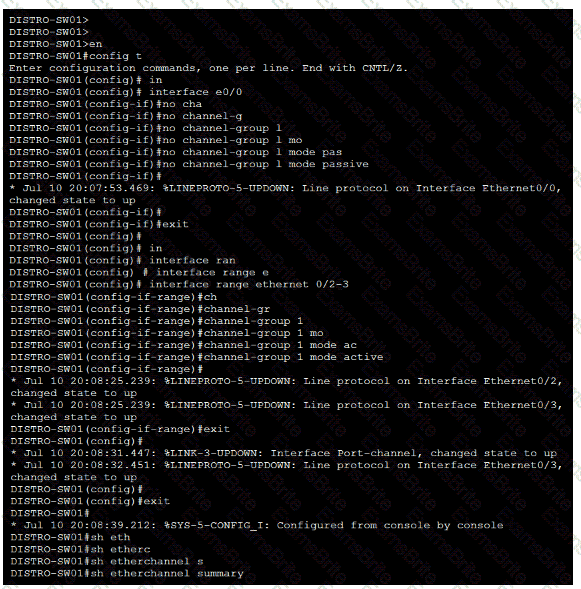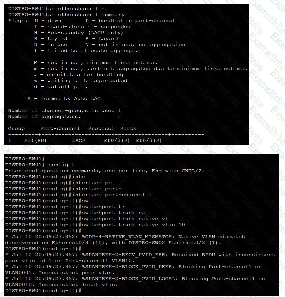 1. Ensure that port channel Po1 between DISTRO-SW01 and DISTRO-SW02 is operational using the LACP protocol. Configuration changes for this task must be made on DISTRO-SW01.
