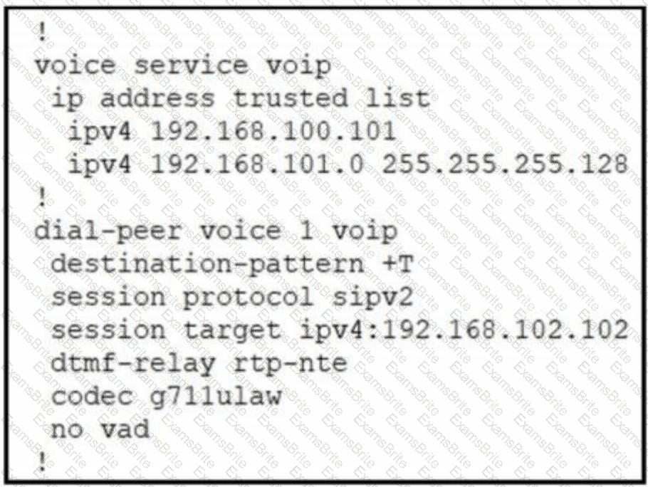 next The engineer logs In to the CUBE, enters the dial.peer configuration level, and runs the voice-class codec 100 command. Which set of commands completes the configuration?