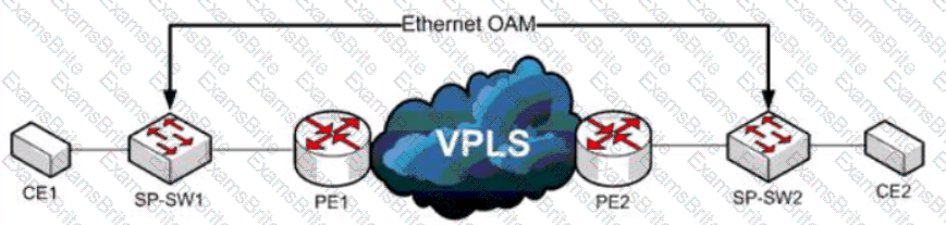 Refer to the exhibit. A service provider has a requirement to use Ethernet OAM to detect end-to-end connectivity failures between SP-SW1 and SP-SW2. Which two ways to design this solution are true? (Choose two)
