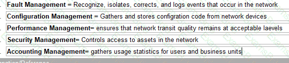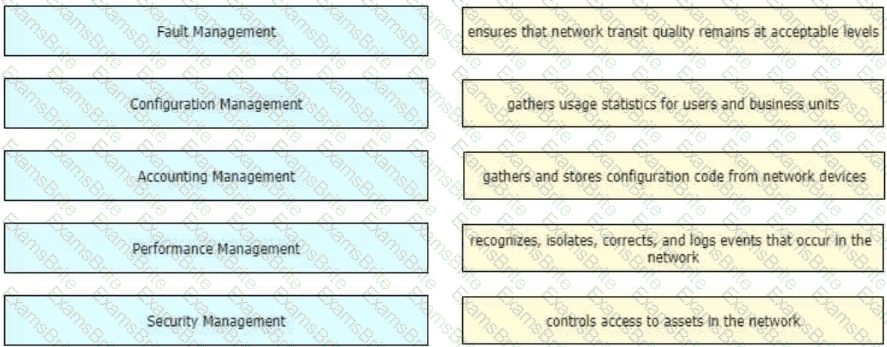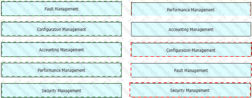 Drag and drop the FCAPS network management reference models from the left onto the correct definitions on the right.