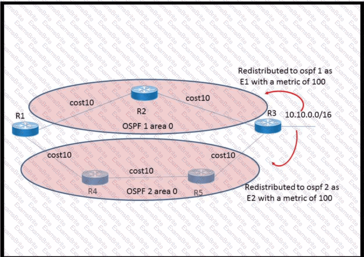 The network 10.10.0.0/16 has been redistributed to OSPF processes and the best path to the destination from R1 has been chosen as R1–R2–R3. A failure occurred on the link between R2 and R3 and the path was changed to R1–R4–R5–R3. What happens when the link between R2 and R3 is restored?