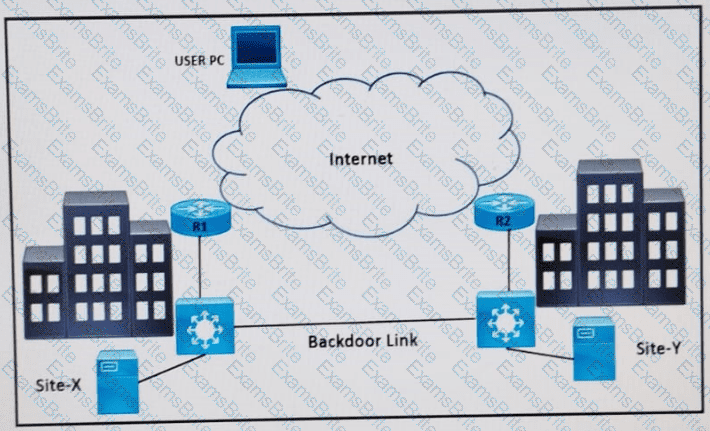 Refer to the exhibit. Two data center sites (X and Y) connect to the Internet and each other using a backdoor link. Both advertise the same IP prefix (100.75.10.0/23) to the Internet. Firewalls are behind R1 and R2.