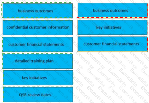 Drag and drop three valid elements of a success plan from the left to the right. Not all options are used. Select and Place: