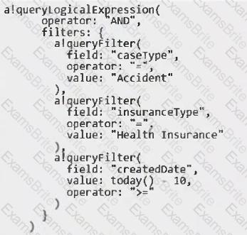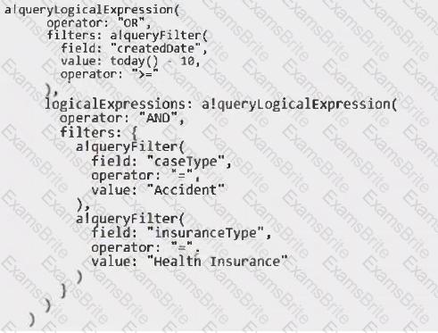 You need to update the query entity to display all the cases that are "Accident" case type and "Health Insurance" insurance type, or created in the last ten days.