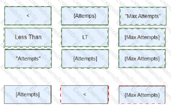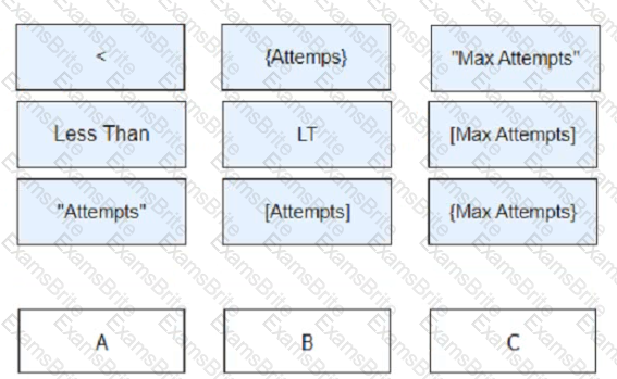 To enable this Process flow to function correctly, drag and drop the items below into the placement boxes (A - C), to create the correct Blue Prism expression for the Retry?' Decision stage.