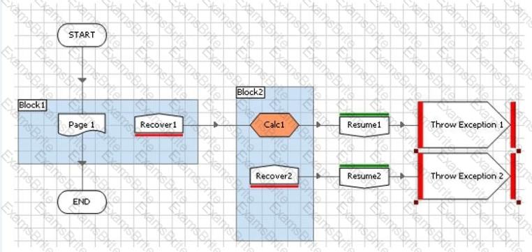 An error has been encountered on Page 1 and the exception has bubbled up to be recovered in the Recover 1 stage. If there is an error in the Calc 1 stage which path will the Process take?