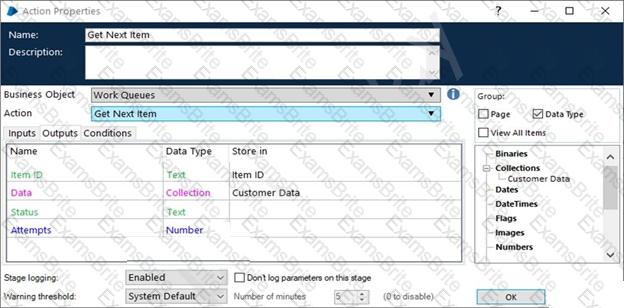 The Outputs tab from the Get Next Item stage is provided below: