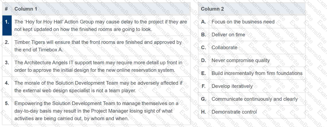 Column 1 lists a selection of project risks identified on the Hoy Hall Hotel project. Column 2 is a list of the DSDM Principles. For each risk in Column 1, select from Column