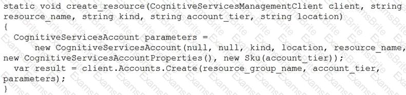 You have the following C# method for creating Azure Cognitive Services resources programmatically.