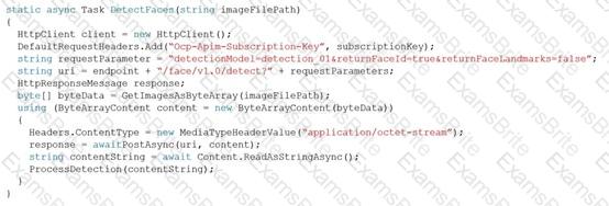 Your company uses an Azure Cognitive Services solution to detect faces in uploaded images. The method to detect the faces uses the following code.