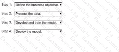Sated and order the steps from the following bat to correctly describe the ML Lifecycle for a new custom modal Select each step one time. (Select and order FOUR.)