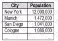 You have a data source that contains data tor every city in the Unites States. The following is a sample of the data.