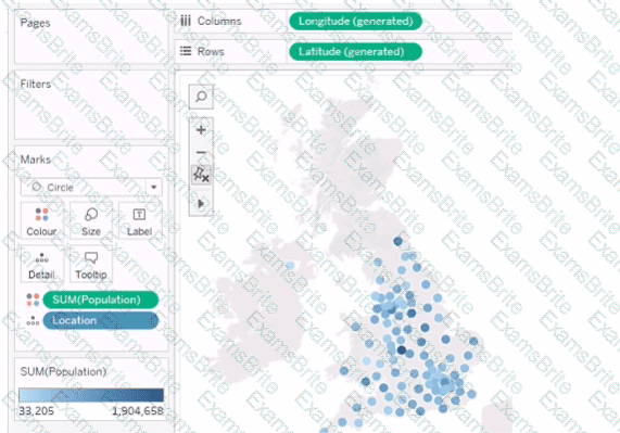 You plan to create a visualization that has a dual axis chart. The dual axis chart will contain a shape chart and a line chart will use the same measure named Population on the axis.