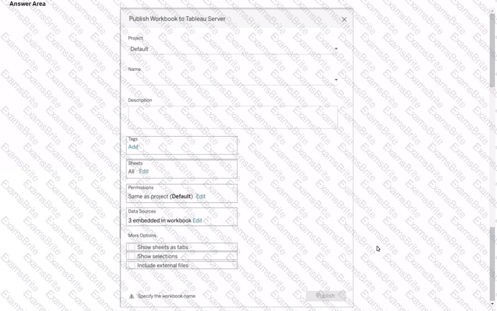 You plan to publish a workbook to Tableau Server.