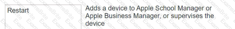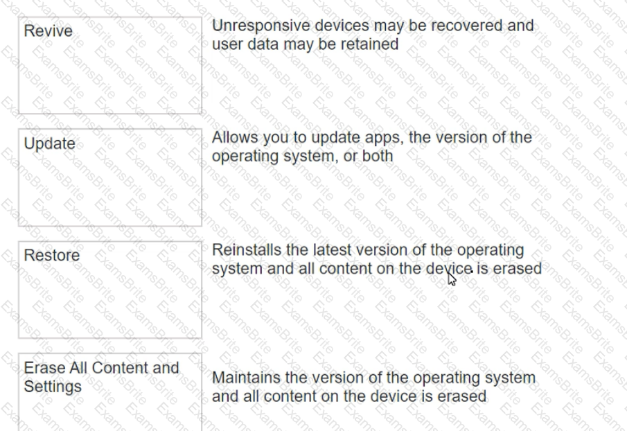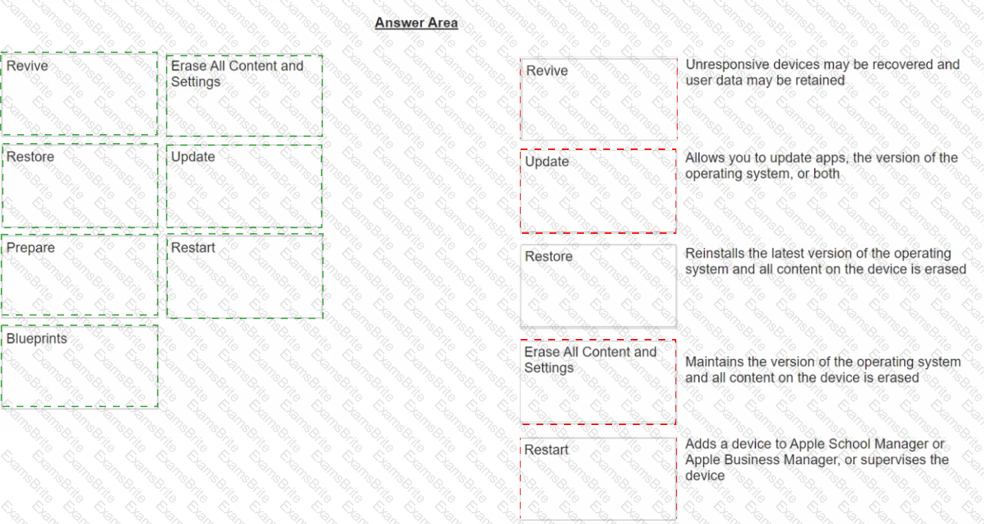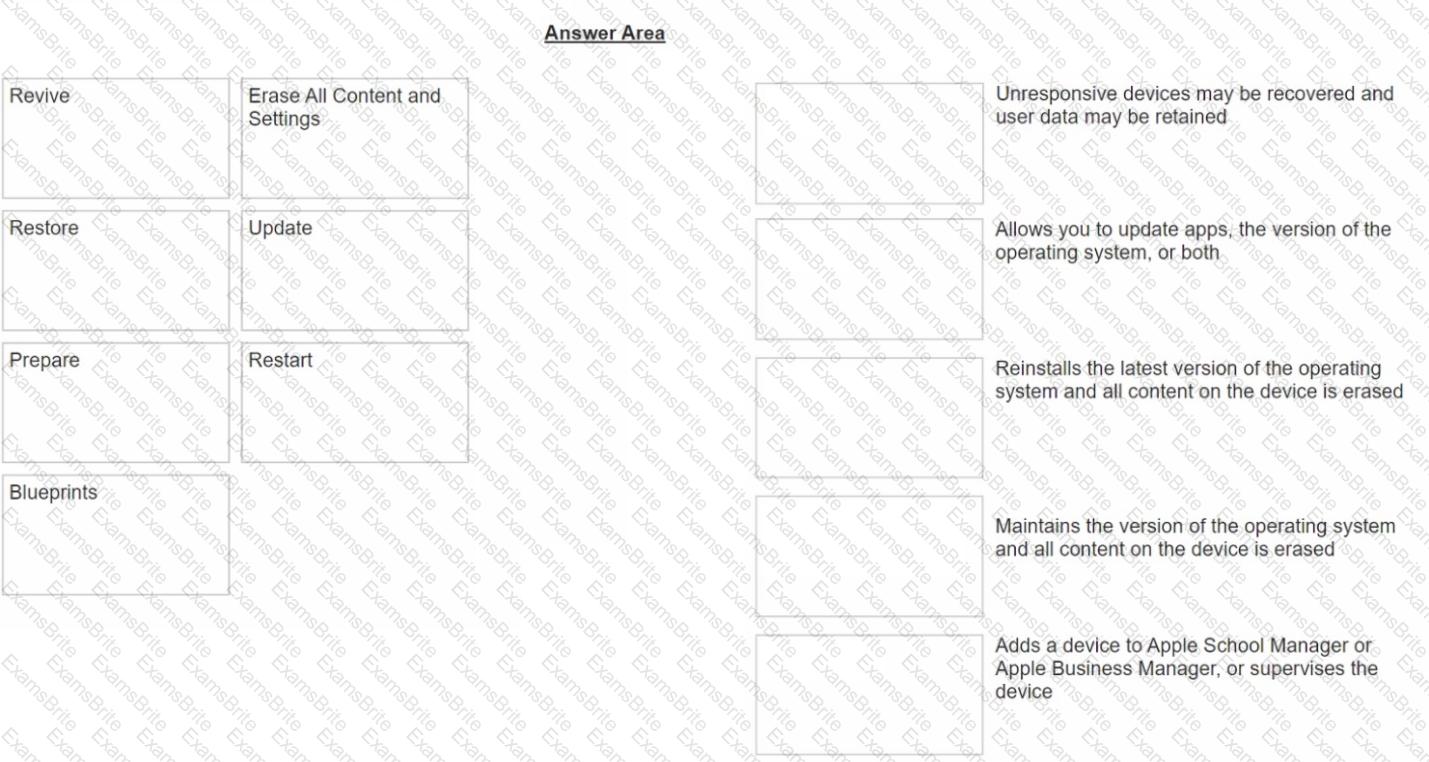Match the Apple Configurator actions on the left to the descriptions on the right by dragging the responses to the correct target areas. Responses may be used once, more than once, or not at all.