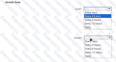You need to configure Azure Backup to meet the technical requirements for cont1 and share1.