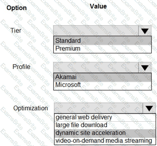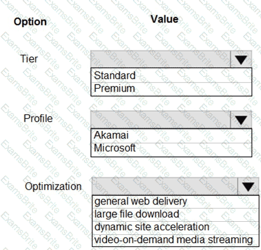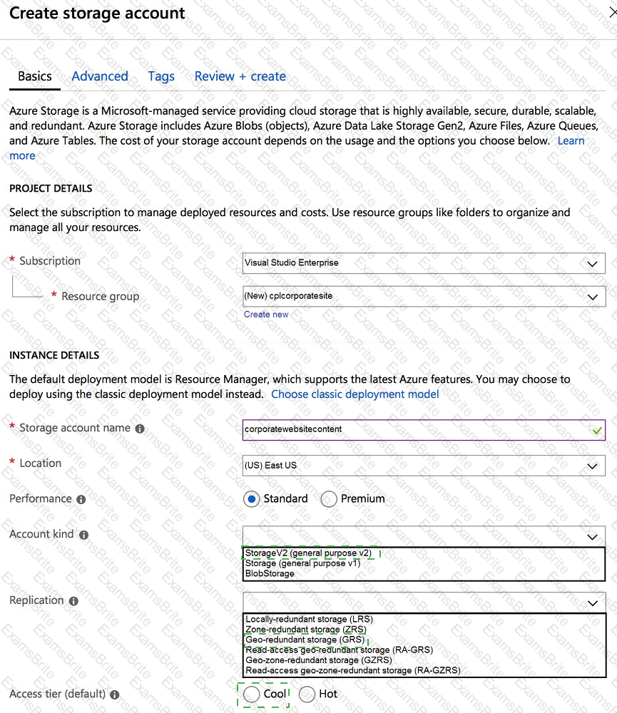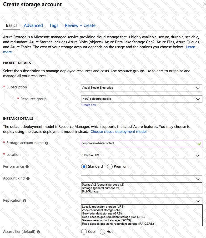 You need to configure the Account Kind, Replication, and Storage tier options for the corporate website’s Azure Storage account.