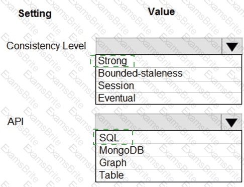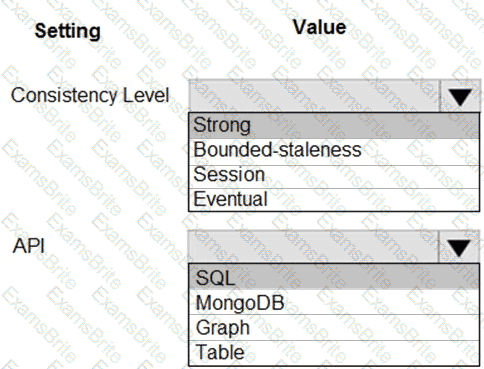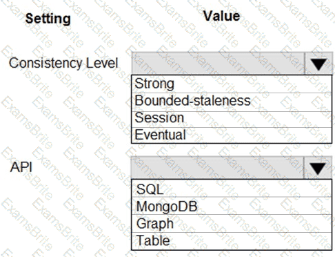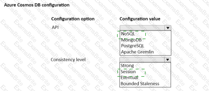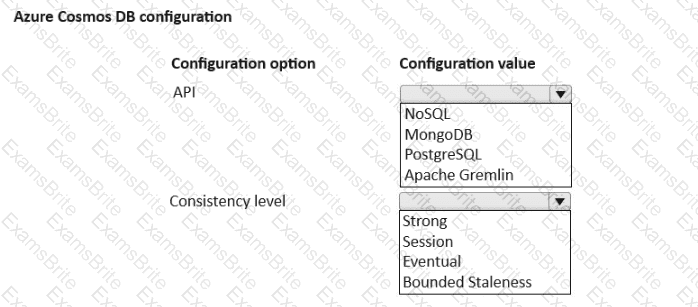 Which Azure Cosmos DB configuration should you use? To answer, select the appropriate options in the answer area.