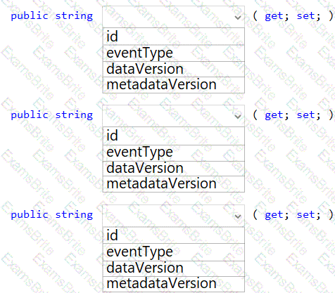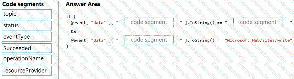 How should you complete the Azure Event Grid subscription? To answer, drag the appropriate JSON segments to the correct locations. Each JSON segment may be used once, more than once, or not at all. You may need to drag the split bar between panes to view content.