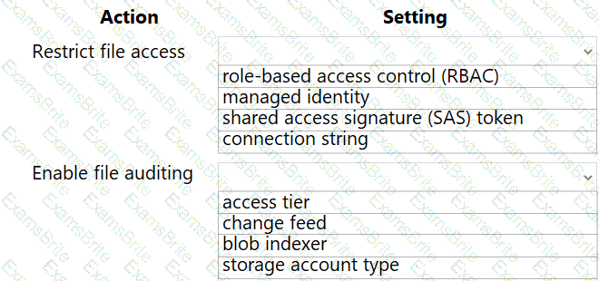 Which Azure Blob storage settings should you use? To answer, select the appropriate options in the answer area.