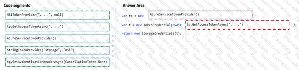 How should you complete the code? To answer, drag the appropriate code segments to the correct locations. Each code segment may be used once, more than once, or not at all. You may need to drag the split bar between panes or scroll to view content.