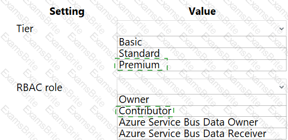 Which Azure Service Bus settings should you use? To answer, select the appropriate options in the answer area.