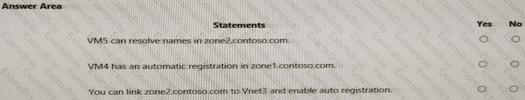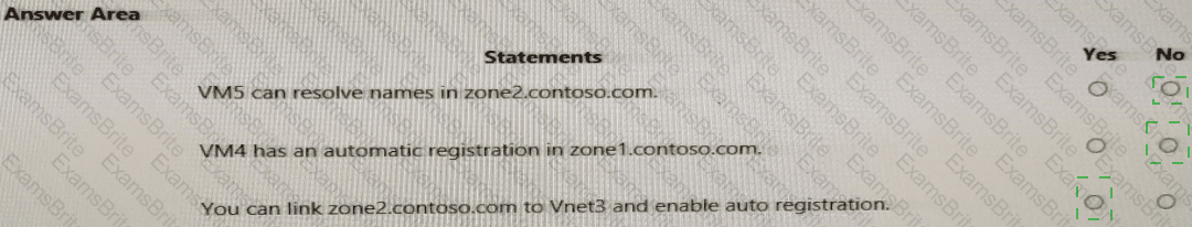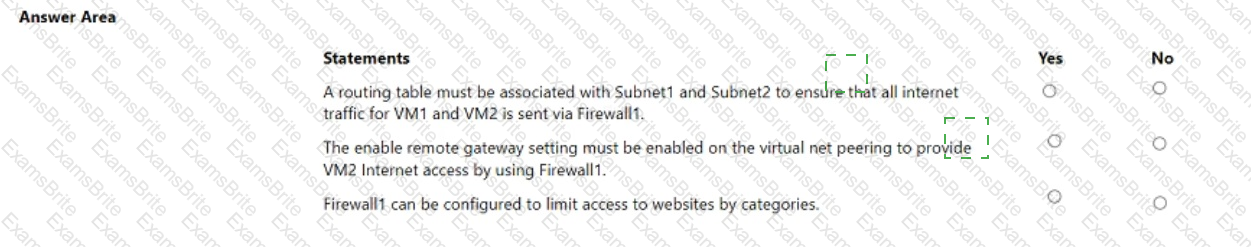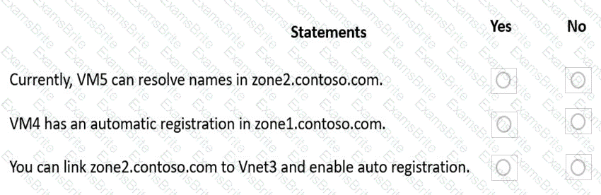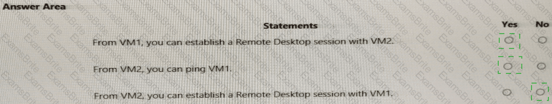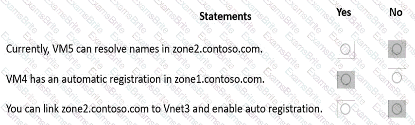 No custom private endpoints. service endpoints. routing tables, or network security groups (NSGs) were created. For each of the following statements, select Yes if the statement is true. Otherwise, select No. NOTE: Each correct selection is worth one point.