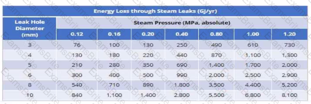 A steam trap with a 6-mm orifice in an 0.8-MPa steam system has failed open. The steam system is pressurized8.760 hours/yr. The steam cost is $15.00 /GJ. Using thetable below, what is the annualcost of the vented steam through the failed steam trap? ignore any condensate return issues.